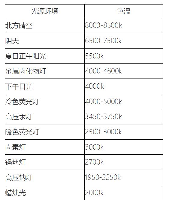 3. 不同光源環(huán)境的相關色溫度光源色溫參數(shù)表